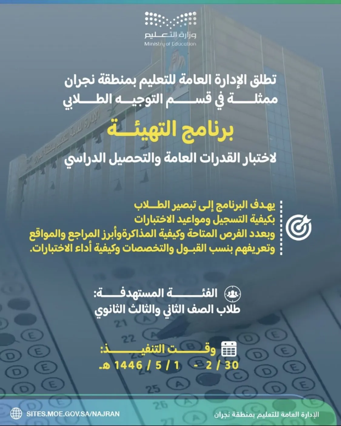 يدشن يوم غدٍ الاثنين رئيس قسم التوجيه الطلابي بتعليم نجران أ/ فواز المونس انطلاقة برنامج التهيئة استعداداً لاختبار القدرات والذي تقيمه الإدارة العامة للتعليم بمنطقة نجران ممثلة في قسم التوجيه الطلابي من مقر ثانوية عبدالله بن عمر
