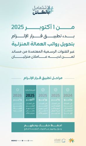 أعلنت وزارة الموارد البشرية والتنمية الاجتماعية، بدء تطبيق المرحلة الرابعة من خدمة تحويل رواتب العمالة المساندة (المنزلية) إلكترونيًا عبر المنصات الرسمية المعتمدة، بدءًا من اليوم في خطوة نوعية تهدف إلى ضمان حقوق العمالة المساندة فيما يتعلق برواتبهم، وتعزيز الشفافية في العلاقة التعاقدية بين صاحب العمل والعامل.
