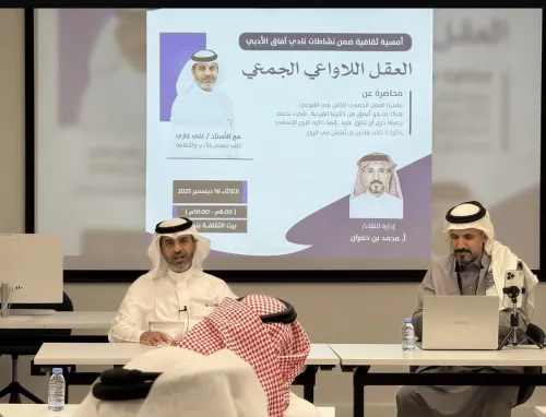 وفي نجران شارك الأديب القدير متعب اليامي بمحاضرة بعنوان ” أبو تمام بين البديع والمعاني ” وأخرى عن “رهين المحبسين.. أبو العلاء المعري ” . وشارك المتألق لؤي المكرمي بلقاء بعنوان ” الجاحظ .. عميد النثر العربي” وآخر بعنوان ” الشعر والطبيعة .. الصوت والصدى ” . كما قدم الأستاذ المبدع صالح آل منصور أمسيتن الأولى ” لماذا نقرأ الأدب؟ ” مستلهمًا مقال ماريو فارغاس يوسا ، والثانية بعنوان ” الواقعية السحرية عند ماركيز .. مائة عام من العزلة نموذجًا ” . وشارك الأستاذ محمد آل فاضل بأمسية ملهمة في السيرة الذاتية ” قراءة في كتاب ( ما لم تقله الوظيفة) لمنصور الخريجي”. وكان لمشاركة أساتذة الجامعة دورًا كبيرًا في دعم أنشطة النادي فبالإضافة إلى حضورهم وإثراء اللقاءات والحوارات قدم الدكتور حسن بن خميس الهمامي محاضرة قيمة بعنوان ” معجزة اللغات وخصائص اللغة العربية ” ، أما الدكتور إبراهيم عسيري فكان له أمسية نقدية بعنوان ” الشعر بين سؤال التجربة والموقف الأيديولوجي ” .. وقد تنوعت الأمسيات فكانت هناك مناقشات جماعية لروايات وكتب مثل ” موسم الهجرة إلى الشمال” للطيب صالح ، وكتاب ” كليلة ودمنة ” لعبدالله بن المقفع ، وجلسة حوارية عن “الأدب الشعبي في منطقة نجران”. ويدرس أعضاء النادي حاليًا إصدار كتاب جماعي وإطلاق مسابقة قرائية واستضافة فعاليات تشكيلية وموسيقية مصاحبة للنشاط الثقافي.