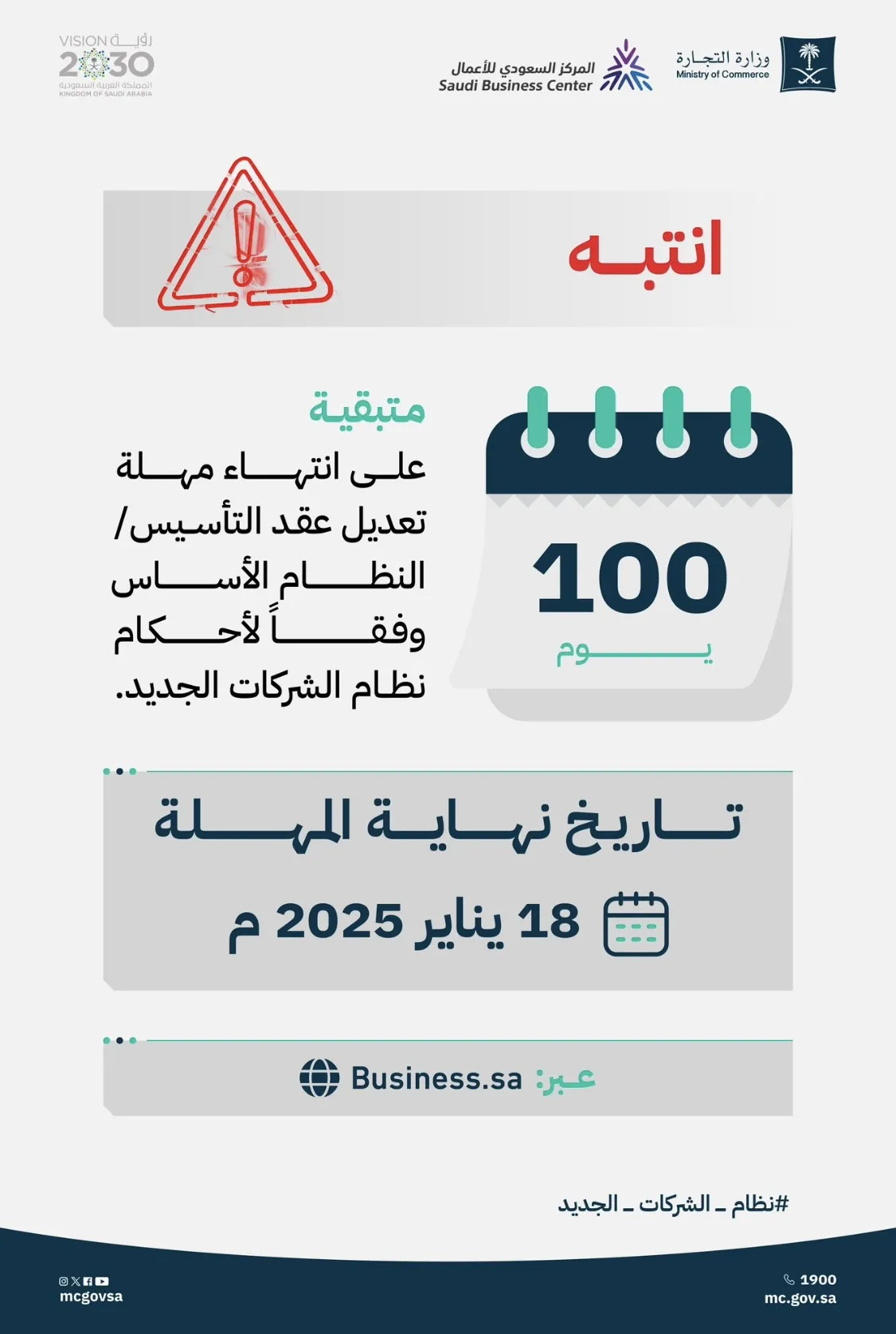 دعت وزارة التجارة الشركات إلى المبادرة لتعديل عقد التأسيس / النظام الأساس وفقا لأحكام نظام الشركات الجديد قبل انتهاء المهلة الممنوحة، حيث تبقى 100 يوم على انتهائها، وذلك في 18 يناير 2025م. وأوضحت الوزارة أن تعديل عقد تأسيس... المزيد