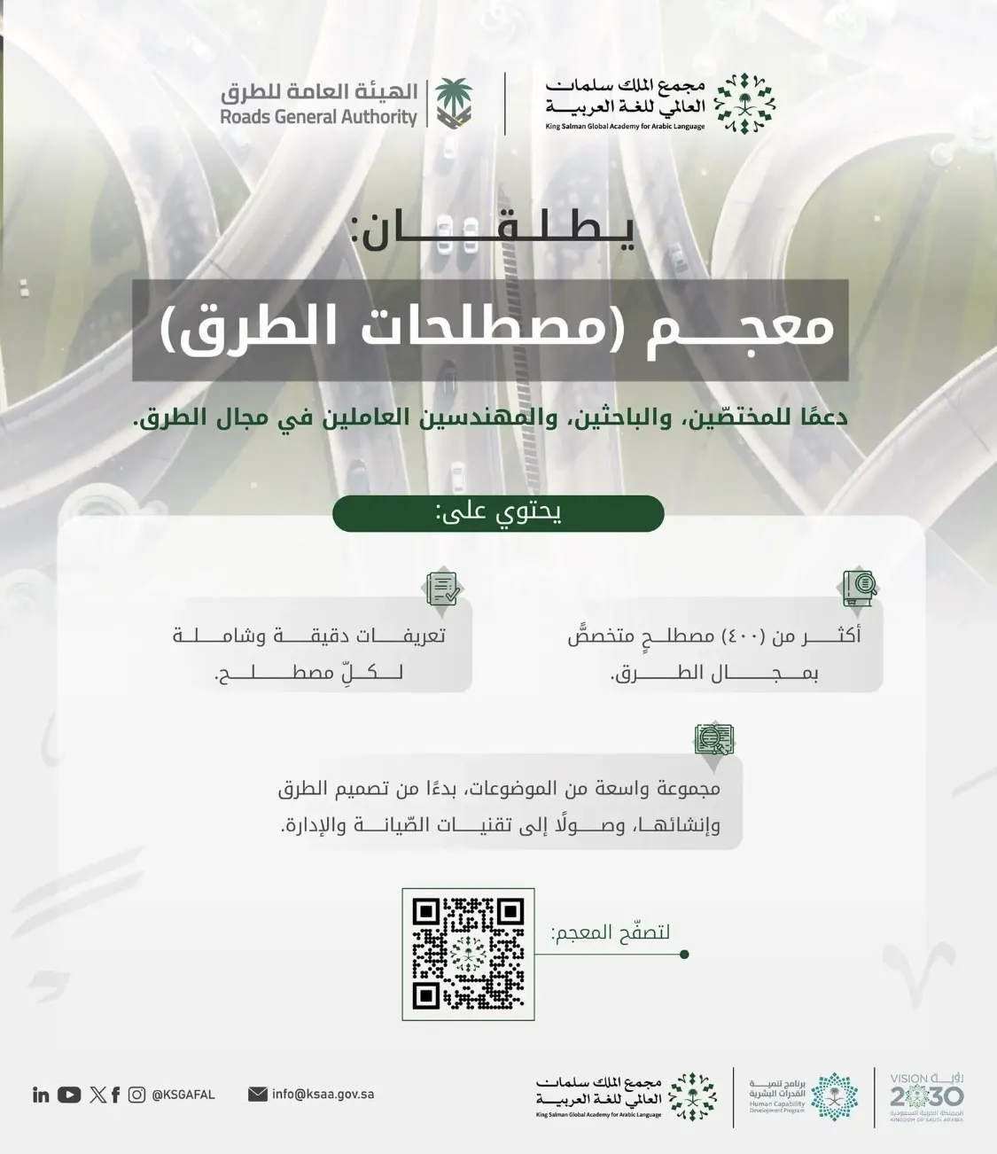أطلق مجمع الملك سلمان العالميّ للُّغة العربيَّة -بالتعاون مع الهيئة العامة للطرق- (معجم مصطلحات الطُّرق) باللُّغة العربيَّة، الذي يستهدف المهتمّين بالمعاجم، والمهتمّين بالطرق ووسائل النقل البريَّة من الجهات المختلفة. ويسعى هذا المعجم إلى توفير مرجع شامل للمصطلحات الخاصّة... المزيد