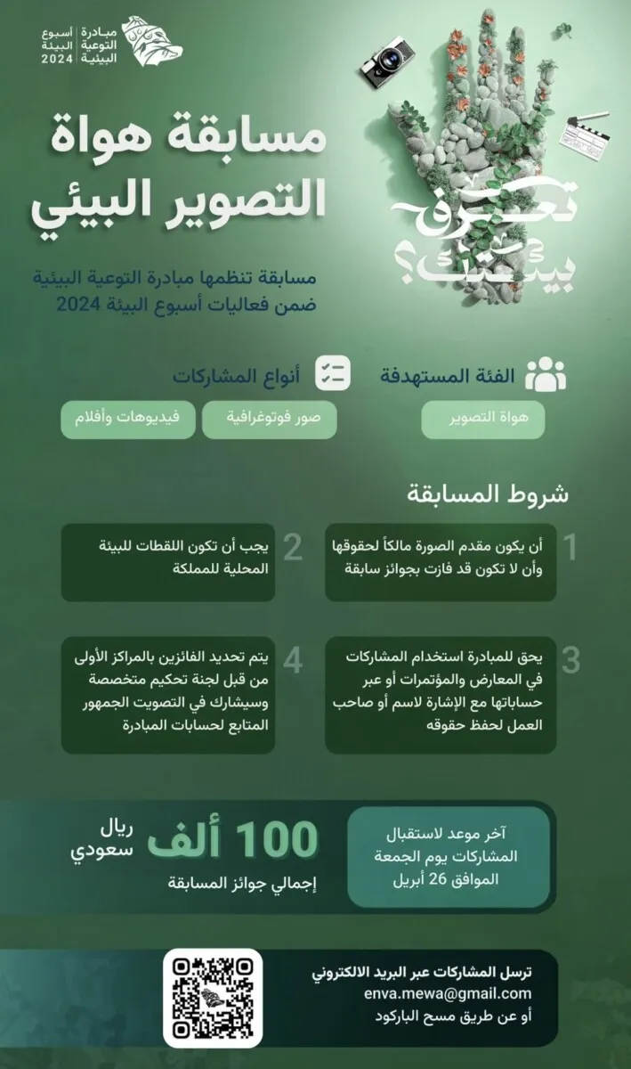 واس أطلقت وزارة البيئة والمياه والزراعة، عبر حساب "مبادرة التوعية البيئية"؛ مسابقة تنافسية لهواة التصوير لاختيار أجمل صورة أو فيديو لبيئتنا المحلية؛ بهدف تعزيز مساهمة الفن في رفع مستوى الوعي البيئي، إلى جانب إشراك أفراد المجتمع في... المزيد