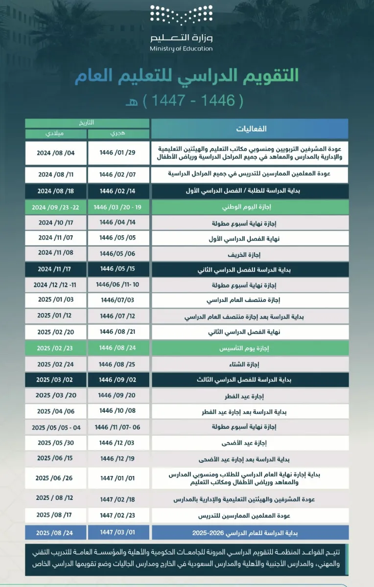 أَعلَنت وزارةُ التعليم عن التقويمَ الدراسيَّ للعام1446-1447 هـ (2025-2024) للتعليم العام، حيث يستمر تطبيق نظام الفصول الدراسية الثلاثة في التعليم العام للعام الدراسي القادم، على أن يتم تحديد النظام الأنســب (فصلين أو ثلاثة فصول دراسية) للأعوام الأربعة المتبقية... المزيد