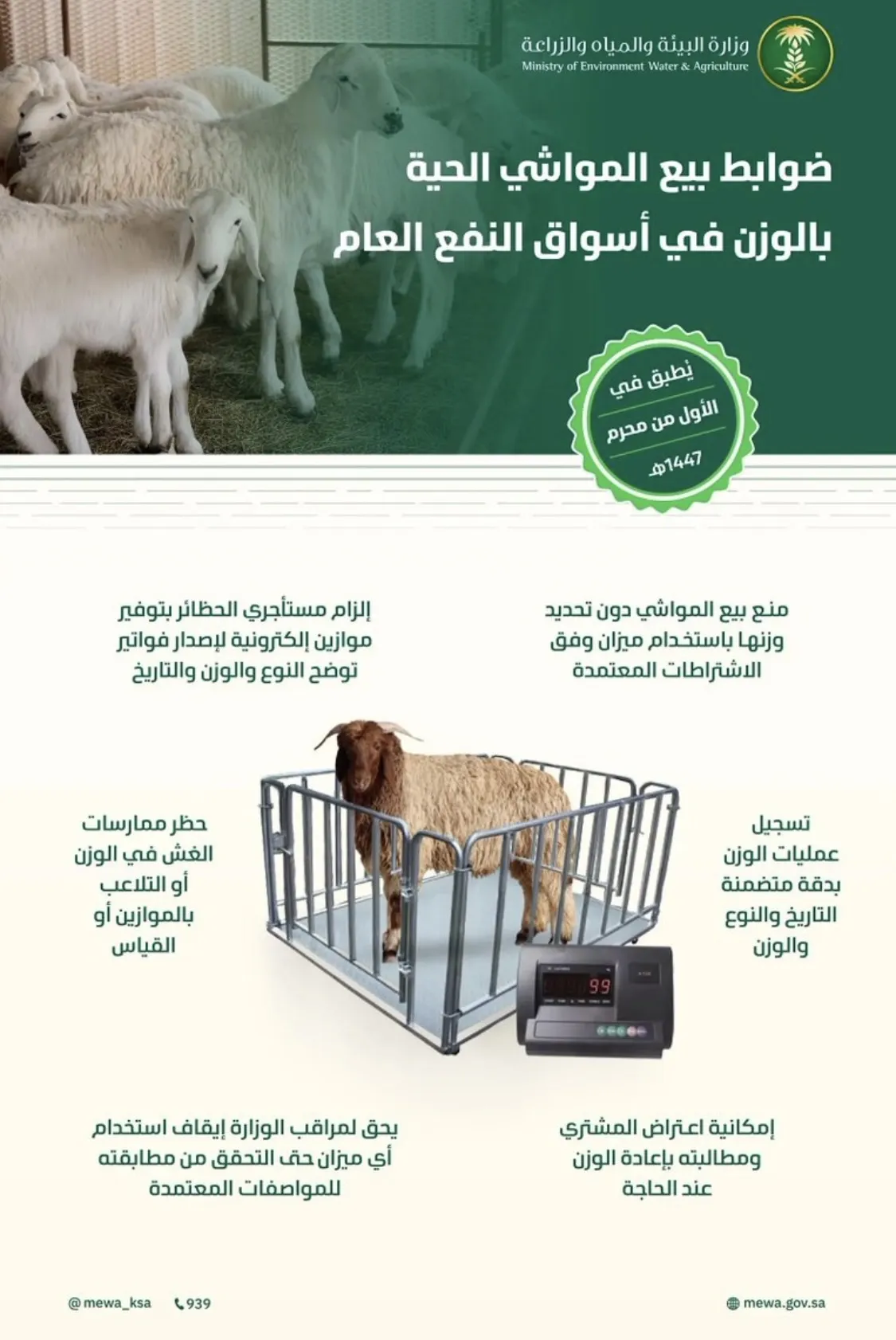 أعلنت وزارة البيئة والمياه والزراعة، ضوابط وآليات بيع المواشي الحية المُعدة للذبح بالوزن، إيذانًا ببدء تطبيق القرار في الأول من محرم 1447هـ، وذلك ضمن جهودها لتنظيم عمليات بيع المواشي في أسواق النفع العام بمناطق المملكة كافة؛ بما يحقق... المزيد