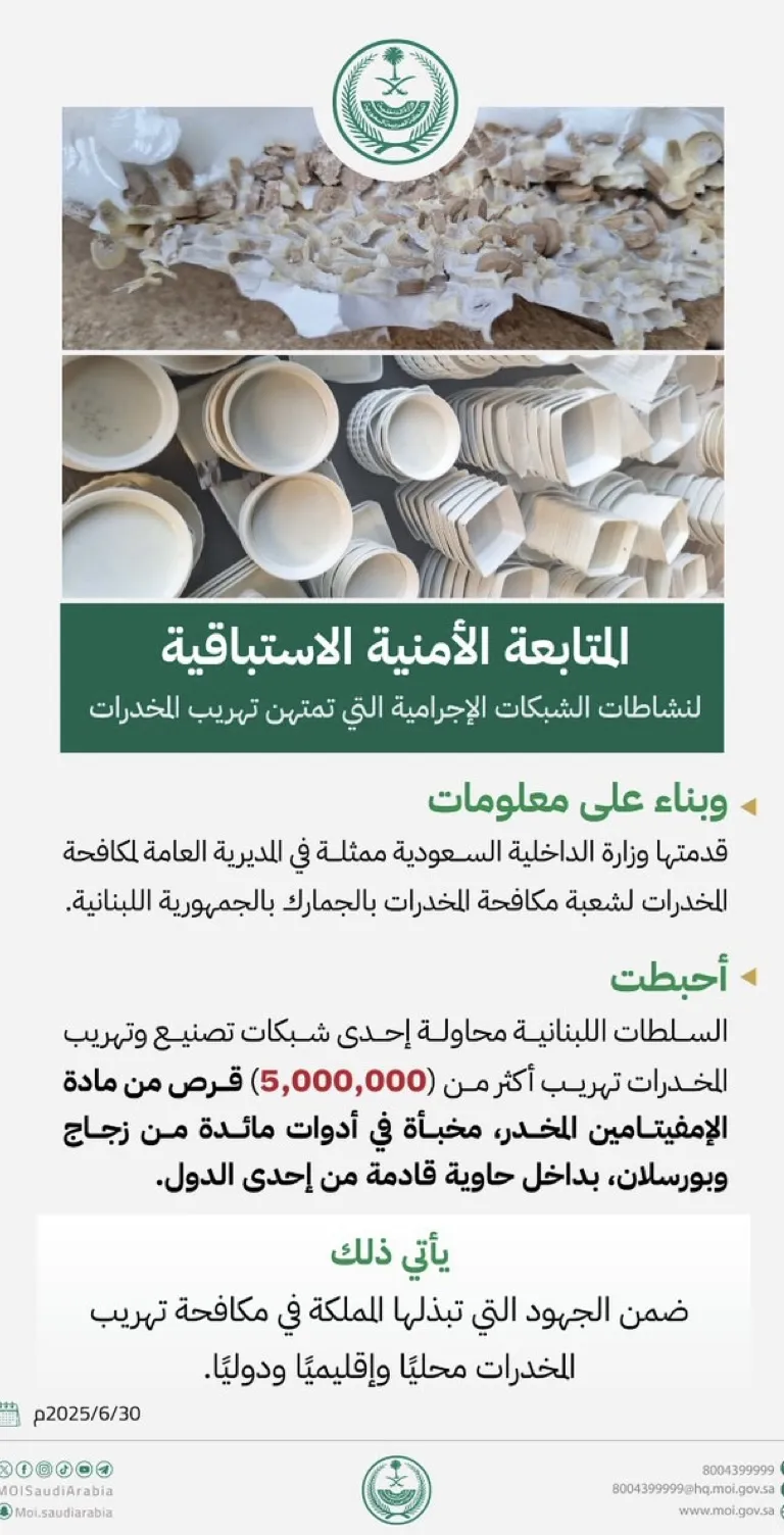أعلن مصدر مسؤول بوزارة الداخلية أنه، وبناءً على ما توافر من معلومات لدى الجهة المختصة بالوزارة، تم ضبط شبكات إجرامية تمتهن تلقي مادتي الإمفيتامين والميثامفيتامين (الشبو) المخدرتين والأقراص الخاضعة لتنظيم التداول الطبي، والاتجار بها بمنطقتي الرياض وحائل، والقبض... المزيد