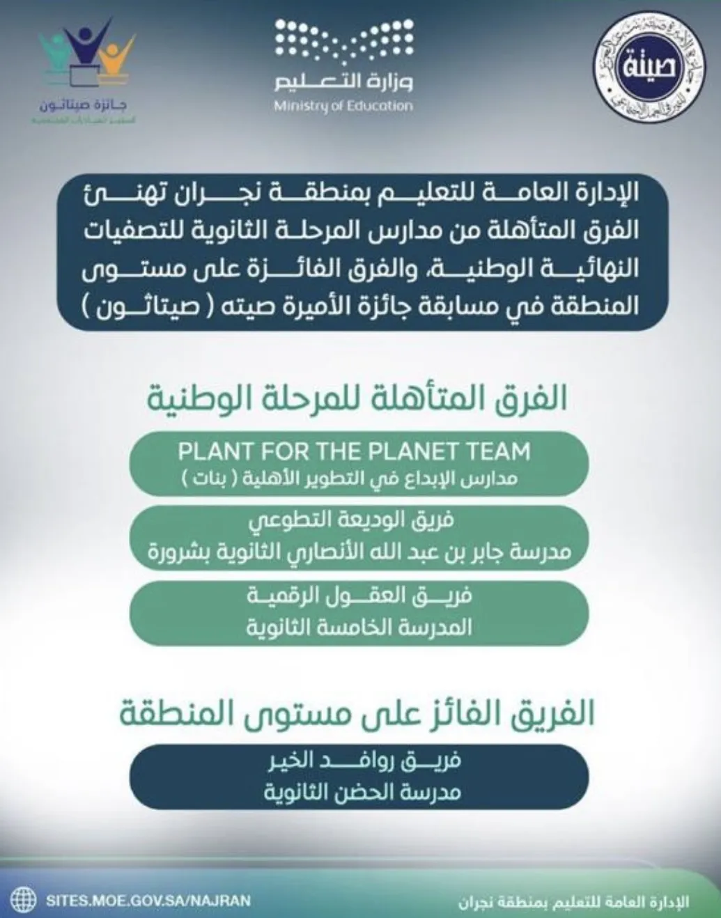 هنأ المدير العام للتعليم بمنطقة نجران د. حسن العلكمي الفرق المتأهلة لنهائيات مسابقة الأميرة صيته بنت عبدالعزيز "صيتاثون" على مستوى وزارة التعليم وكانت التصفيات الأولية قد شهدت تسجيل عدد كبير من المشاريع على مستوى المملكة وتأهل منها عدد... المزيد
