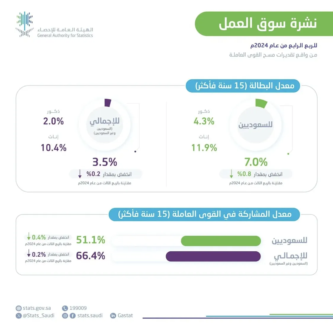 واس أصدرت الهيئة العامة للإحصاء اليوم إحصاءات سوق العمل للربع الرابع 2024. ووفقًا لنتائج النشرة فقد انخفض معدل البطالة لإجمالي سكان المملكة (السعوديين وغير السعوديين 15 سنة فأكثر) إلى 3.5%، كما سجل معدل البطالة للسكان السعوديين (الذكور والإناث... المزيد