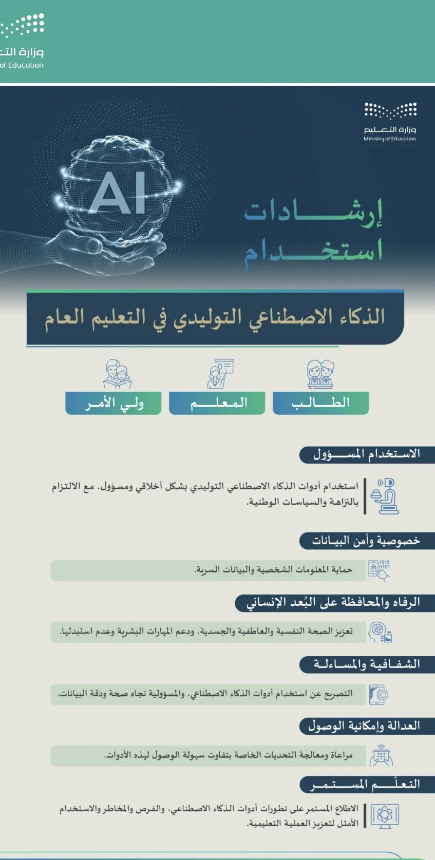 أصدرت وزارة التعليم بالتعاون مع الهيئة السعودية للبيانات والذكاء الاصطناعي (سدايا)، الدليل الإرشادي لاستخدام الذكاء الاصطناعي التوليدي في التعليم العام في خطوة نوعية؛ تهدف إلى رفع جودة التعليم وتحسين مخرجاته بشكل أخلاقي ومسؤول بما يكفل المحافظة على دور... المزيد