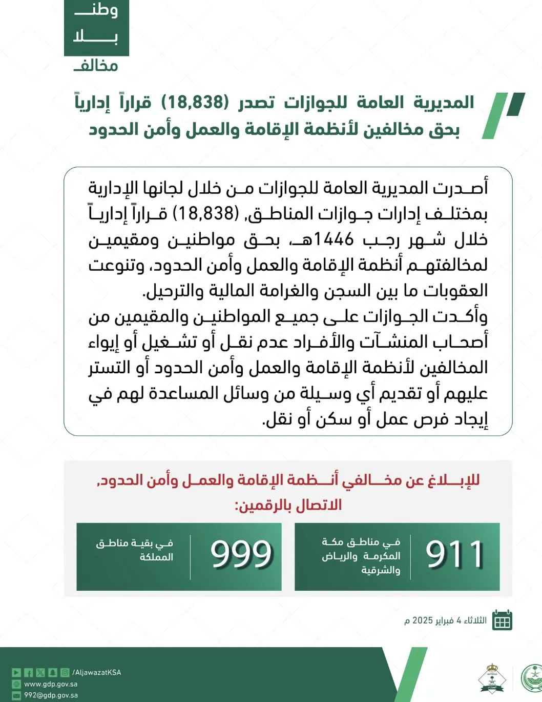 أصدرت المديرية العامة للجوازات من خلال لجانها الإدارية بمختلف إدارات جوازات المناطق 18,838 قرارًا إداريًا خلال شهر رجب 1446هـ، بحق مواطنين ومقيمين لمخالفتهم أنظمة الإقامة والعمل وأمن الحدود، وتنوعت العقوبات ما بين السجن والغرامة المالية والترحيل. وأكّدت الجوازات... المزيد