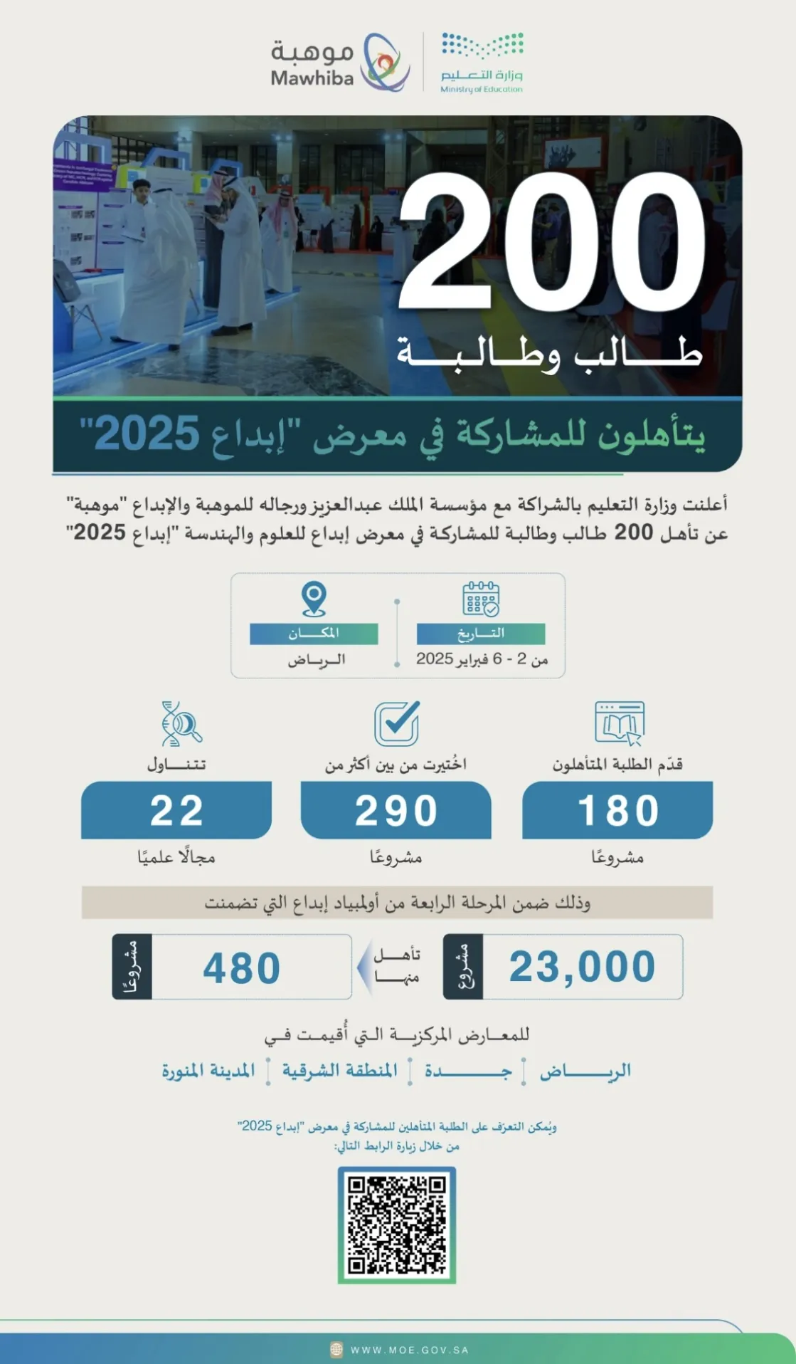 أعلنت وزارة التعليم بالشراكة مع مؤسسة الملك عبدالعزيز ورجاله للموهبة والإبداع "موهبة"، عن تأهل 200 طالب وطالبة للمشاركة في معرض إبداع للعلوم والهندسة "إبداع 2025"، والذي سيُقام في الرياض خلال الفترة من 2 إلى 6 فبراير المقبل. وقدّم... المزيد
