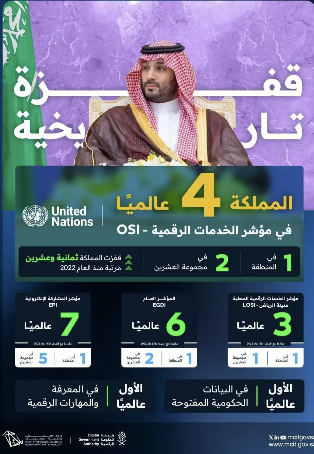 قفزت المملكة العربية السعودية (25) مرتبة في مؤشر الأمم المتحدة لتطور الحكومة الإلكترونية 2024، لتكون ضمن مجموعة الدول الرائدة على مستوى العالم، وحققت المركز (الرابع) عالمياً و(الأول) إقليمياً و(الثاني) على دول مجموعة العشرين في مؤشر الخدمات الرقمية، بالإضافة... المزيد